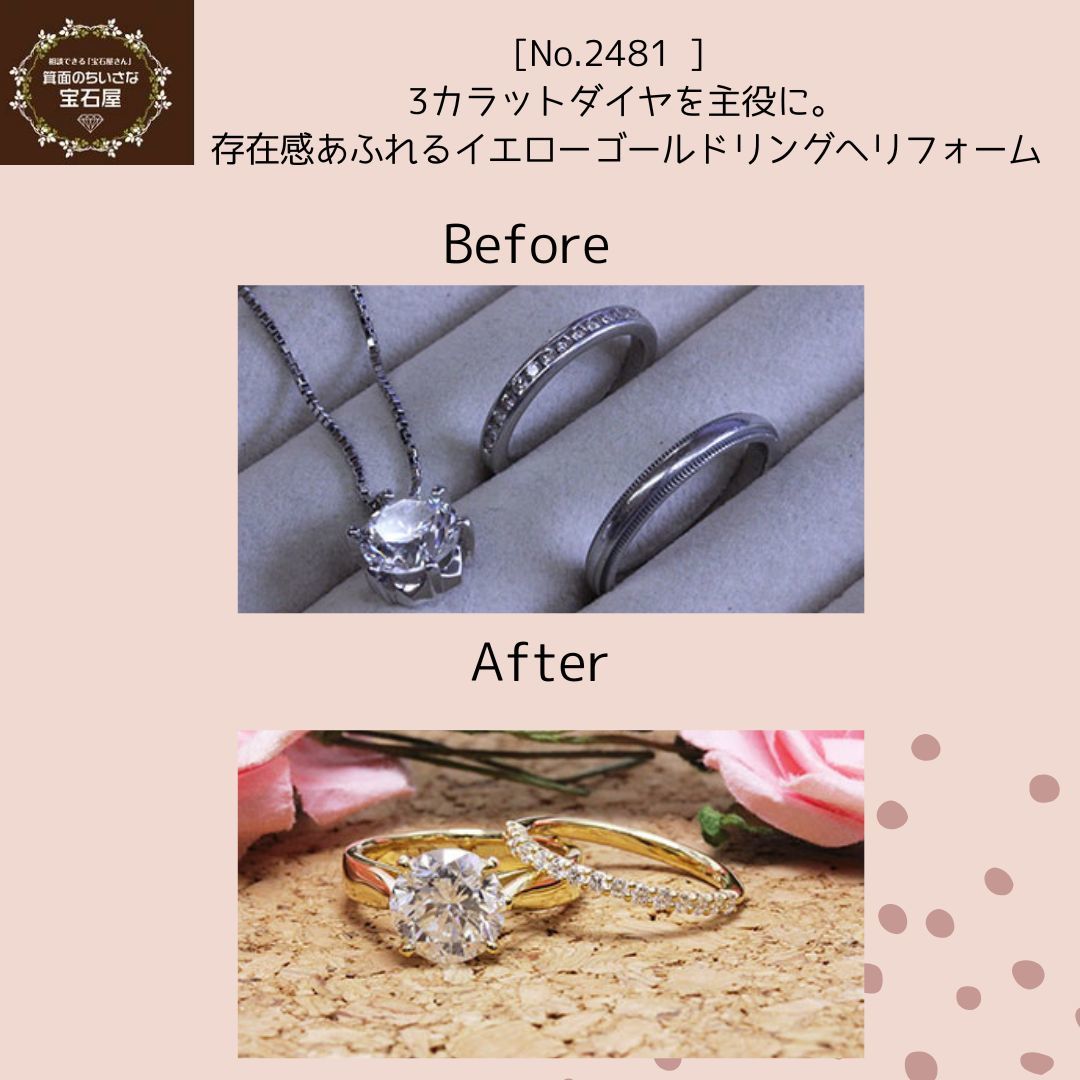 お持ちの3カラットのダイヤモンドネックレスと、プラチナのハーフエタニティリングを活かし、新たなリング2本へのリフォームをご希望とのこと。