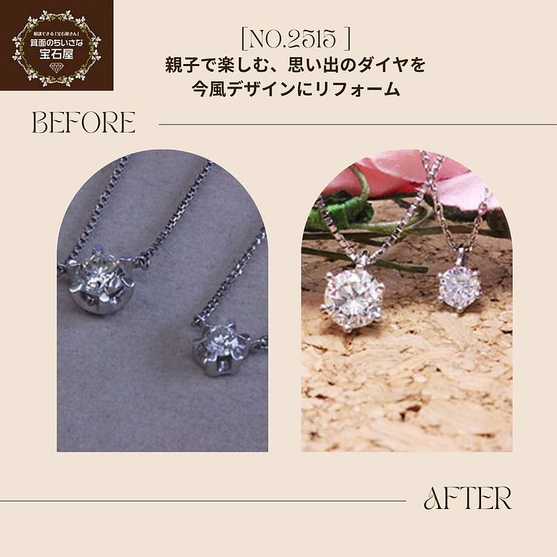 「今の自分たちに合った、すっきりしたネックレスにしたい」とのご希望に応え、両方ともに現代的で軽やかな6本爪のトップにリフォーム。