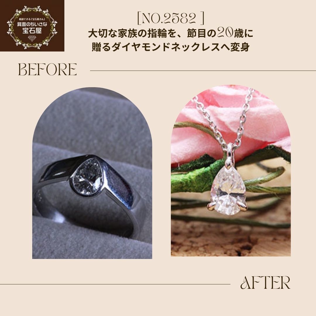 以前にもご利用くださったことのあるリピーター様で、今回は義母様から譲り受けたペアシェープカット(涙型)のダイヤモンドリングを、お嬢様の20歳の記念にネックレスへ作り替えたいとのことでした。