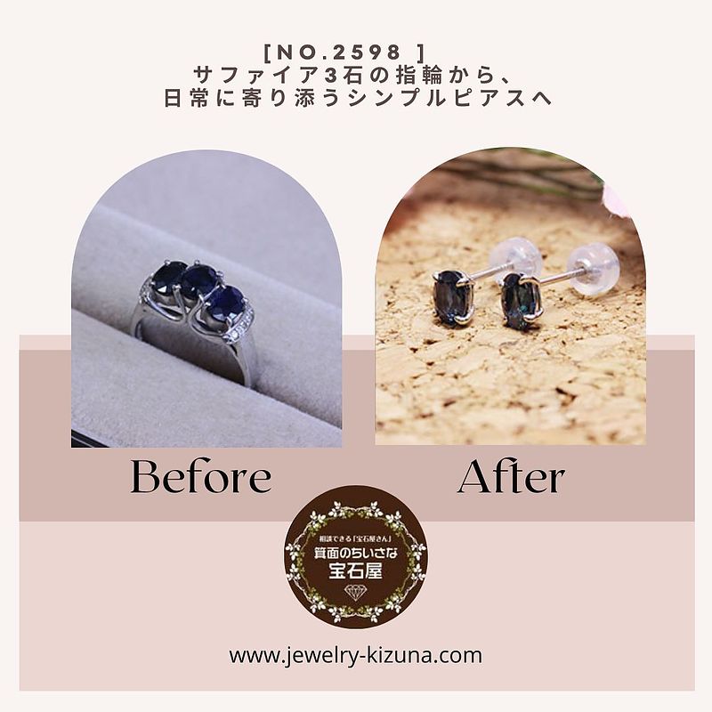 お持ち込みいただいたのは、サファイアを3石使用した指輪。存在感のあるデザインでしたが、「このままでは使う機会がなくて」とのことで、2石を使ってシンプルなピアスへリフォームしたいというご相談でした。