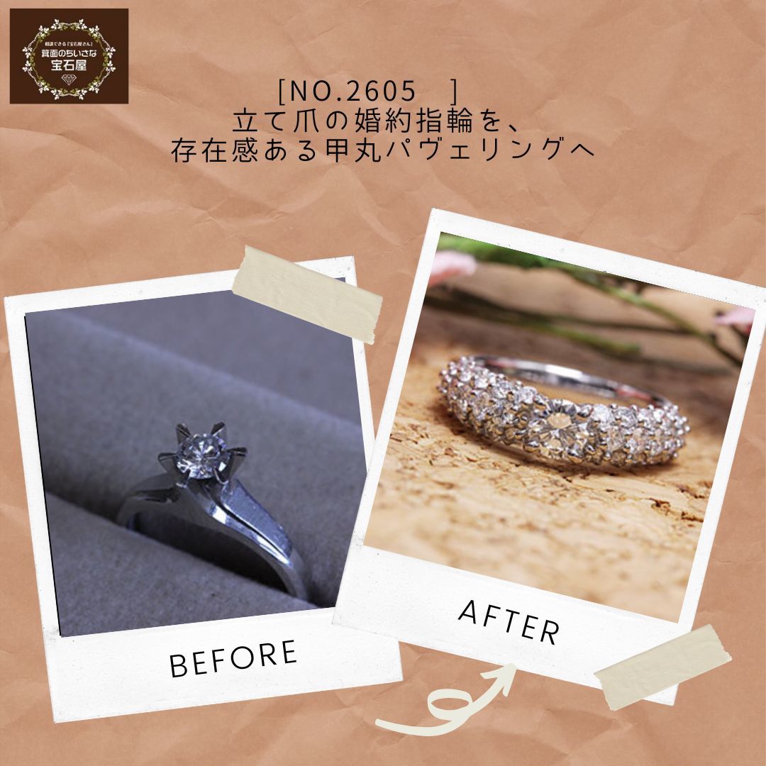 立て爪の婚約指輪を、存在感ある甲丸パヴェリングへ