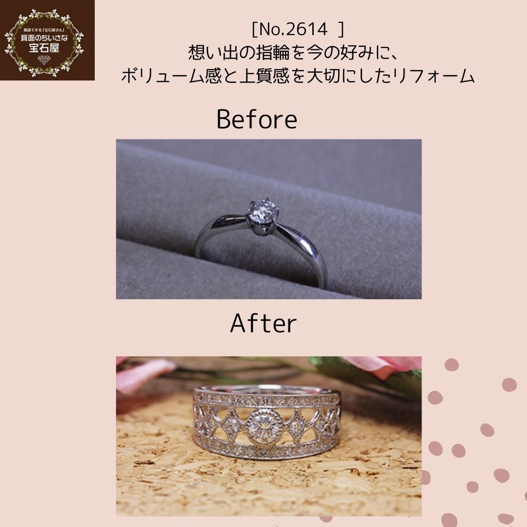 婚約指輪は、細身のデザインから、存在感のある幅広タイプへ変更したいとのご希望でした。