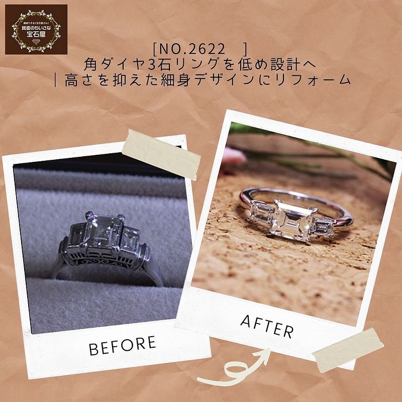 宝塚市にお住まいのリピーター様より、角ダイヤが3石並んだ豪華なリングのリフォームをご相談いただきました。