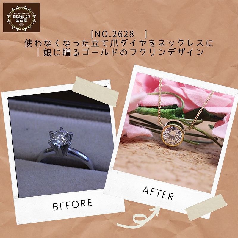 その仕上がりにご満足いただけたことから、今回はお手持ちの立て爪ダイヤの指輪を、ネックレスへリフォームしたいとのご希望でした。