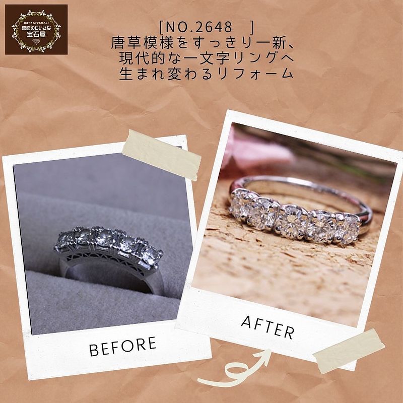お持ちいただいたのは、お祖母様から譲り受けられたダイヤモンド5石の一文字リング。