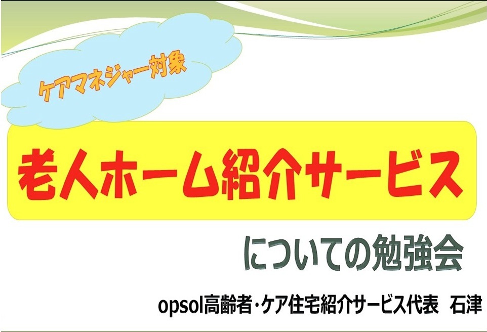 今回はそんな状況の中、ご相談をいただいた「居宅介護支援事業所」のケアマネジャーを対象に行った、「老人ホーム紹介サービスの活用法」についての勉強会の様子を報告します。