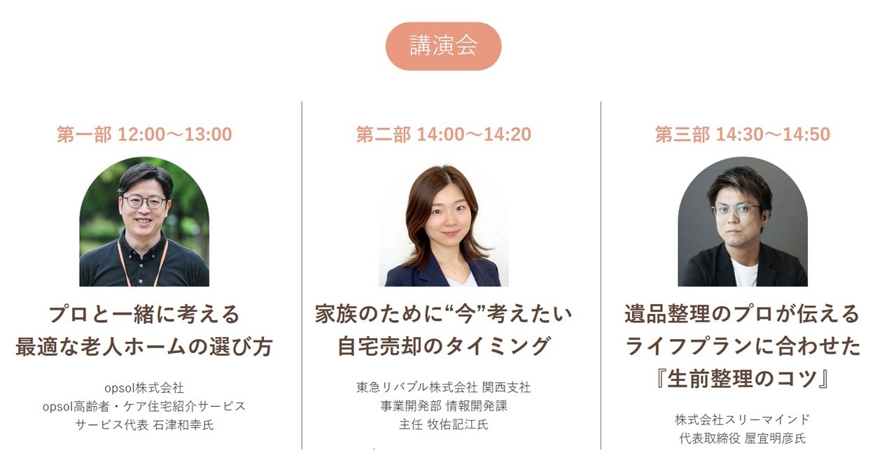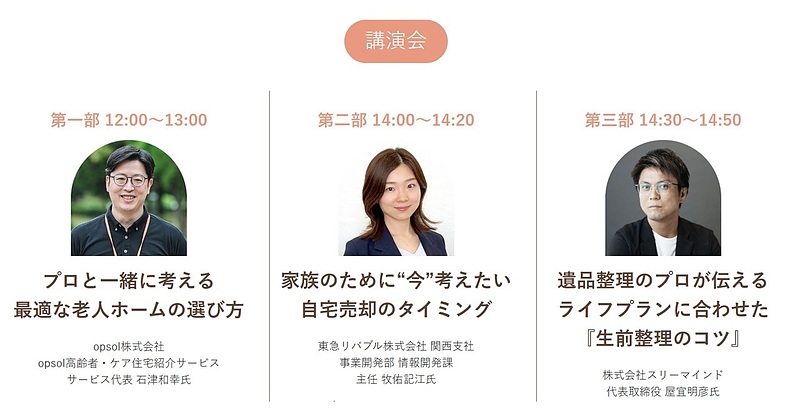 参加費用無料で様々な講演や12の有名老人ホーム運営会社の情報収集が出来る魅力的なイベントとなっています。
