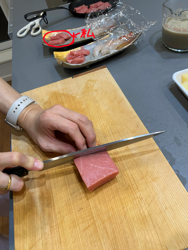 奥の刺身が私が切ったもの、手前が妻が切ったもの。
