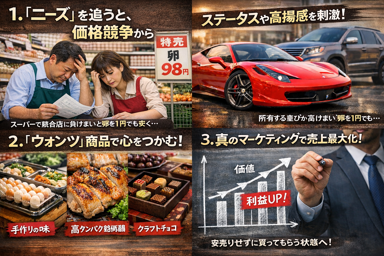 顧客の「ニーズ(必要性)」ではなく、「ウォンツ(欲求)」を刺激できているかにあります 。