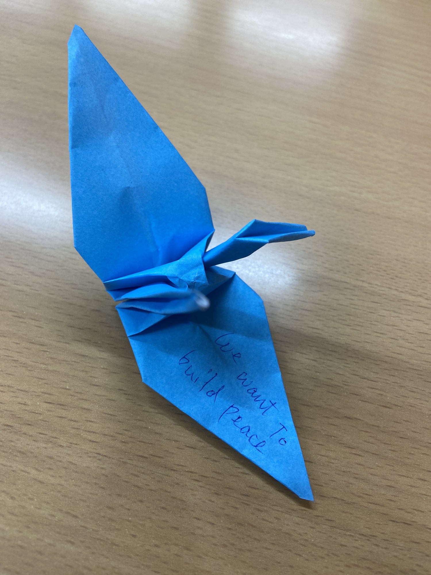テーマ別分科会では、ハワイ真珠湾のアリゾナ記念館に展示されている佐々木禎子さんの折り鶴コーナーを維持・発展させているサダコプロジェクトの取り組みが紹介されました。参加者も交流しながら鶴を折り、平和メッセージを書いて、ハワイに送りました。Peace Builderを育てるという言葉が印象的でした。