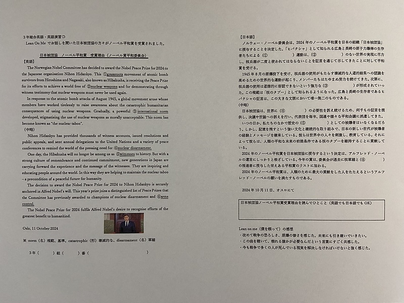 平和教育プロジェクトを学習した後、 日本被団協がノーベル平和賞を受賞したというニュースが流れました。生徒たちもニュースを見ていて、プロジェクト映像に登場していたトシユキさんたちが受賞で喜んで泣いていたねと話に来てくれました。ノルウェー ・ ノーベル委員会がその受賞と受賞理由を発表しているのを聞いて、格調高く論理的な文章だったので、 委員会HPから取り込み、 訳読プリントを作成しました。 構成はまず重要語句の日本語訳を穴埋めしながら読解する形でその後感想を書かせました。授業では最初にスピーチ映像を見せた後、プリントに取り組ませました。 難しい単語も多かったですが、 説明をしっかり聞いてくれて、 題材の力を強く感じました。