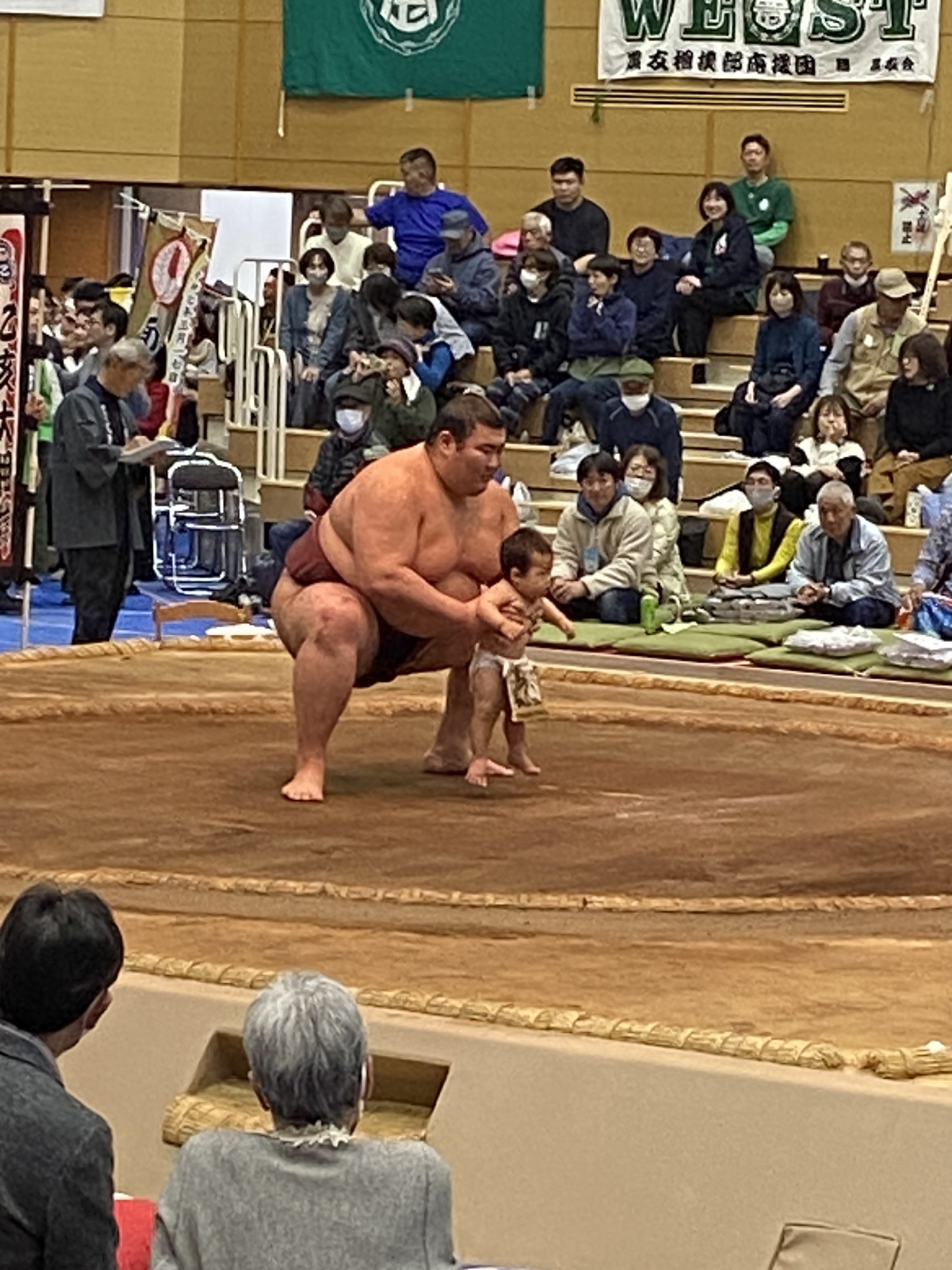稚児の土俵入りでは、熱海富士関や風賢央関が稚児を抱えてシコを踏んで土俵に立たせてあげて、まわりをご家族がオリジナルのぼりを持って囲みました。観客全員が「ヨイショ」と掛け声を掛けて暖かい声援と拍手を送り、会場は暖かい雰囲気に包まれました。