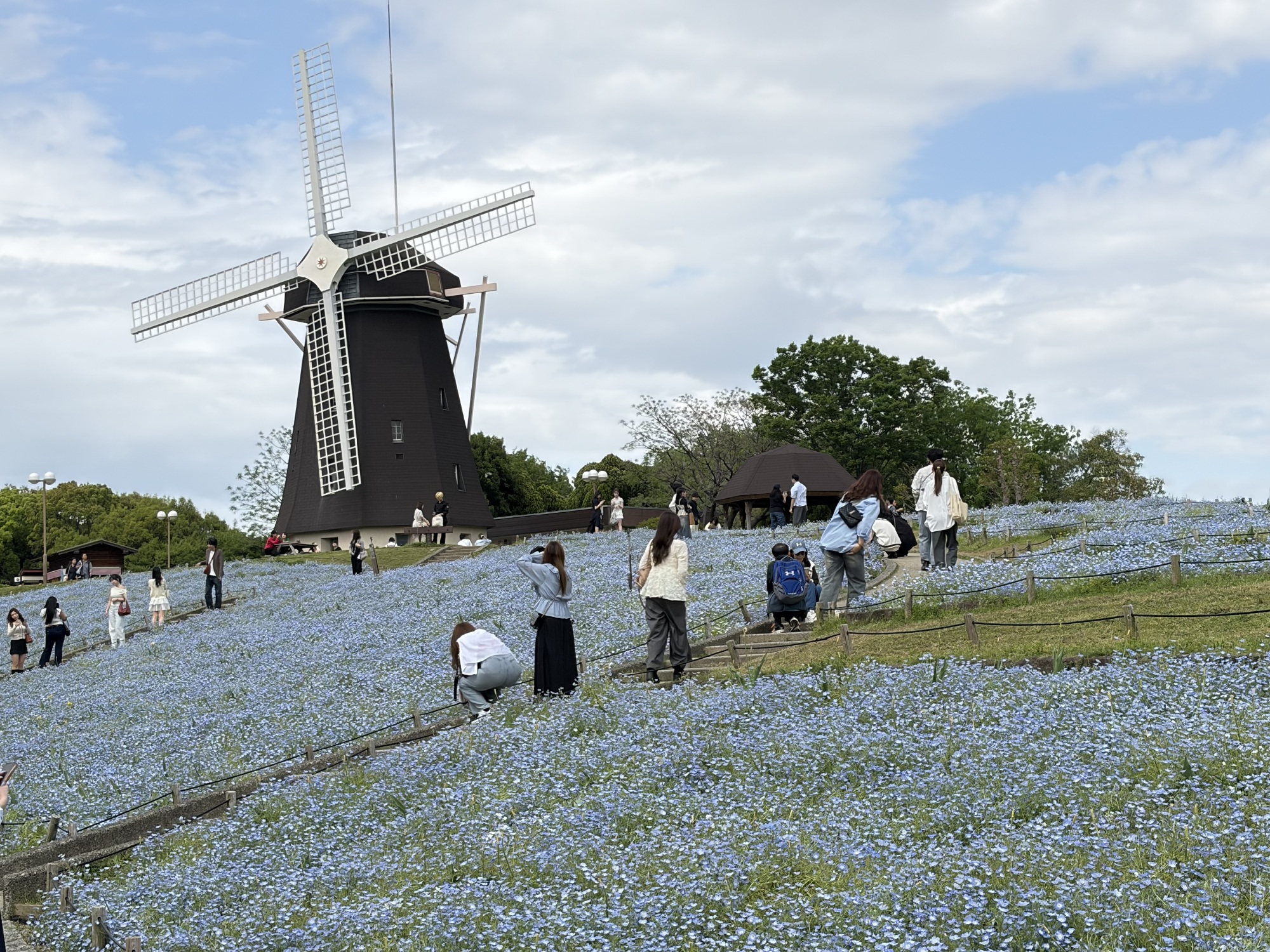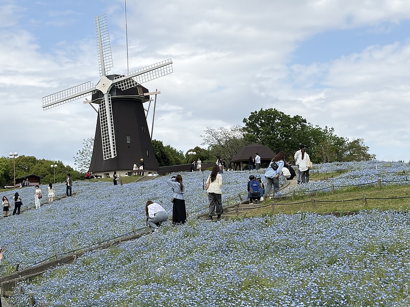 風車の丘大花壇には、外国へ行ったかのような錯覚にとらわれる立派な風車が回り、青い可憐なネモフィラが大花壇を埋め尽くし、美しく咲き誇っていました。入園無料でこの壮観な眺めを見られてとても幸せで、実に多くの人々が訪れて、花の季節を楽しんでいました。
