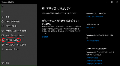 ●「デバイスセキュリティー」を開き、「お使いのデバイスは標準ハードウェアセキュリティーの要件を満たしていません」と表示が出たら、Windows11のアップグレード要件に関わる部分が満たされていないことになるでしょう。