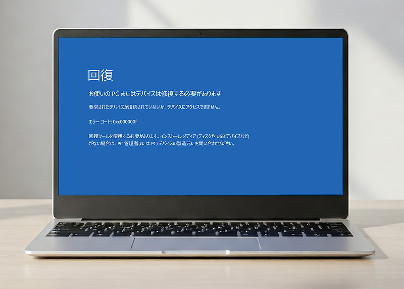 青い画面で、「回復 お使いのPCまたはデバイスは修復する必要があります」と表示がる場合、着目点はその下に表示してある「エラーコード」です。例えば、エラーコード:0xc0000001 や 0x000000f などの表記があれば前述と同様にそのエラーコードをもとにネットで調べたり、メーカーや修理業者にそのコードを示して問い合わせます。