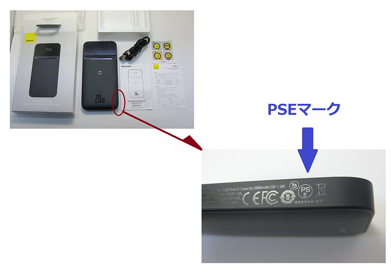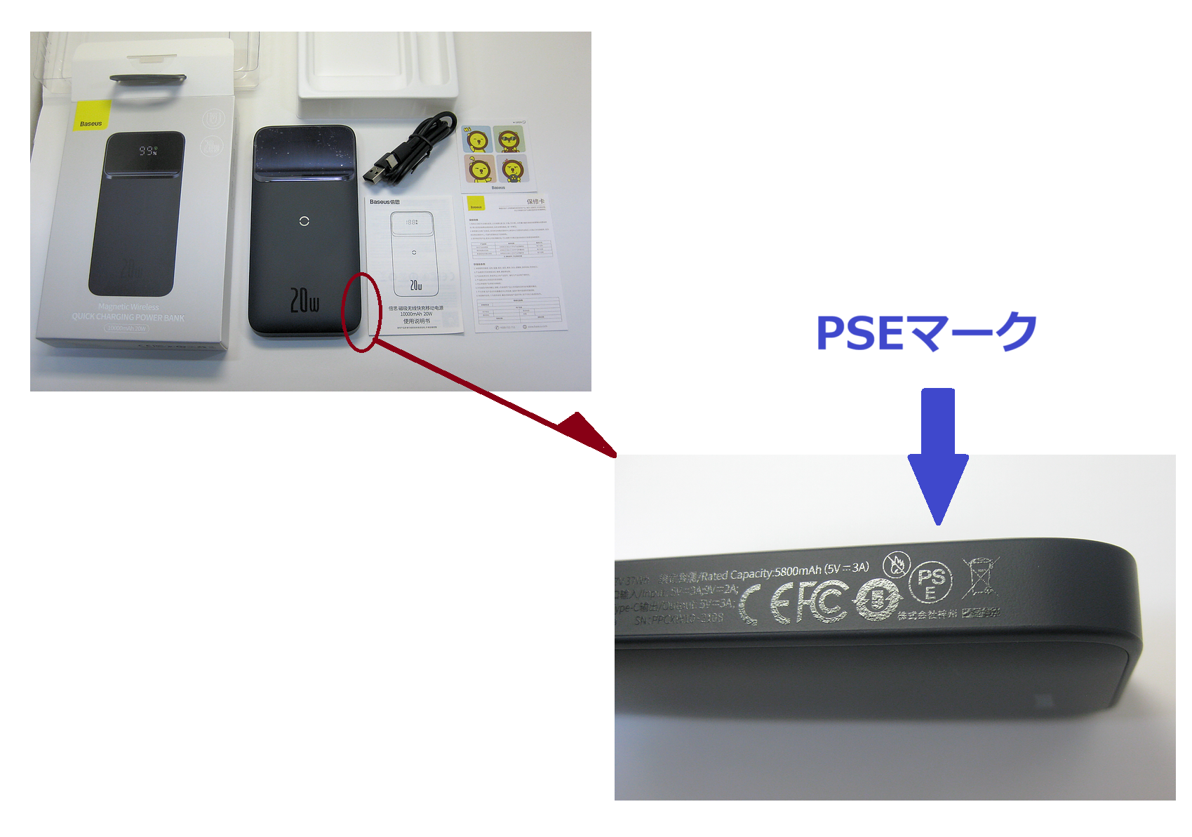 適切なPSEマークが記されたモバイルバッテリー。社名などは認証機関のホームページで公開されている。