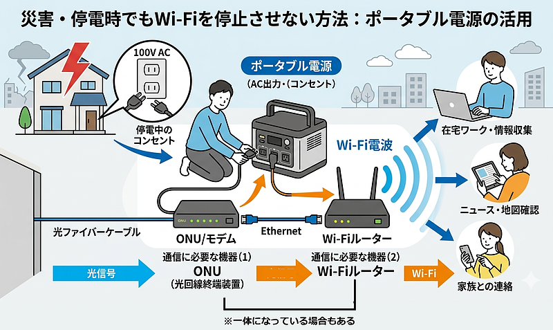 停電時にインターネットが使えなくなる主な原因は、回線そのものではなく「自宅側の電源喪失」です。ポータブル電源を活用すれば、条件付きですがこの弱点を補い、固定回線を含めた通信環境を維持できる可能性が高まります。