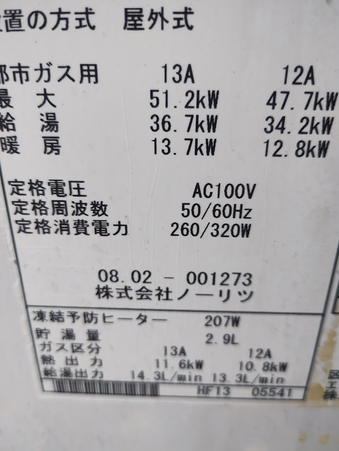 *製造年月は株式会社ノーリツの上に書いてある0802となります。