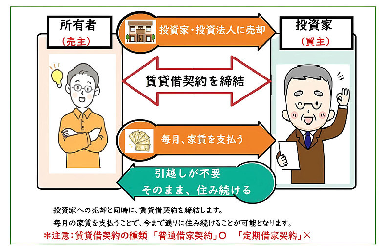 リースバックは、お客様がお住まいの不動産を一度売却し、売却後はその不動産を賃貸物件として借り、家賃を支払うことでそのまま住み続けることができる仕組みです。所有権は売却先に移りますが、住む場所を変える必要がないため、生活環境を維持しながら経済的な問題を解決することが可能です。
