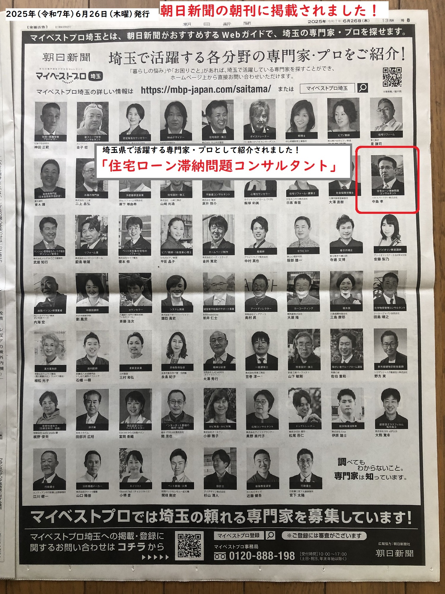 この度、ハウスパートナー株式会社が、なんと朝日新聞の朝刊に、住宅ローン滞納問題の専門家として掲載されました!さらに、朝日新聞がおすすめする専門家サイト「マイベストプロ埼玉」にも、「住宅ローン滞納問題コンサルタント」として紹介されています。これは、私たちの長年の実績と専門知識が、公に認められた証です。