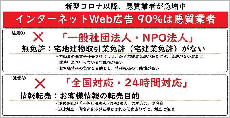 【理由】 任意売却に公的機関は存在しません。公的機関を装い全国から相談者を集める手法です。最大の問題は、こうした法人の多くが**「宅地建物取引業免許」を持っていない**ことです。免許がないため、法的に債権者交渉や売却実務ができず、結局別の業者に転売されます。