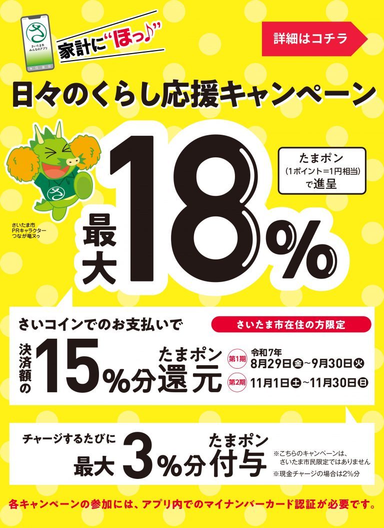からだ調整ラボは、現在最大18%還元キャンペーン中の「さいコイン・たまポン決済」に対応しています。