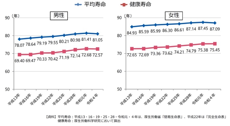 下の資料の令和4年男性の「平均寿命が81歳」「健康寿命が72歳」だとしたら、72歳からの9年間は不健康な状態(要介護など)とされ、この差が短いほど良いとされています。