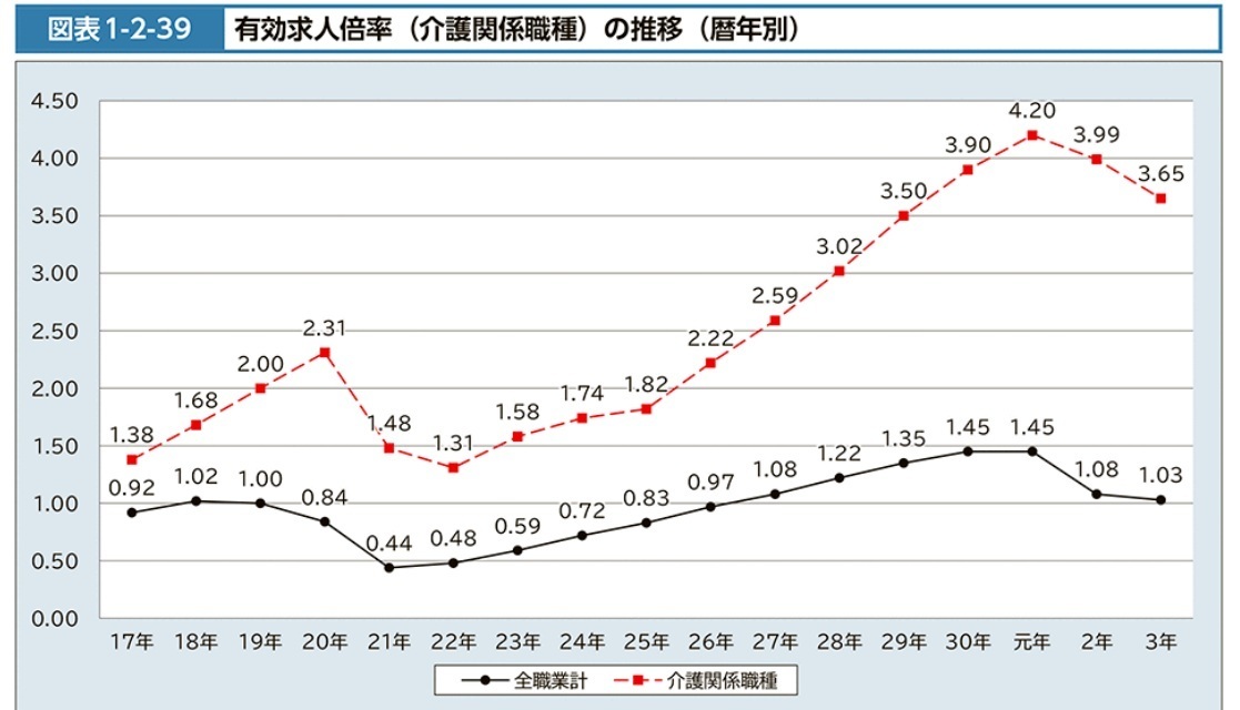 介護職の求人倍率(1人に対して求人する企業の数)令和3年まで