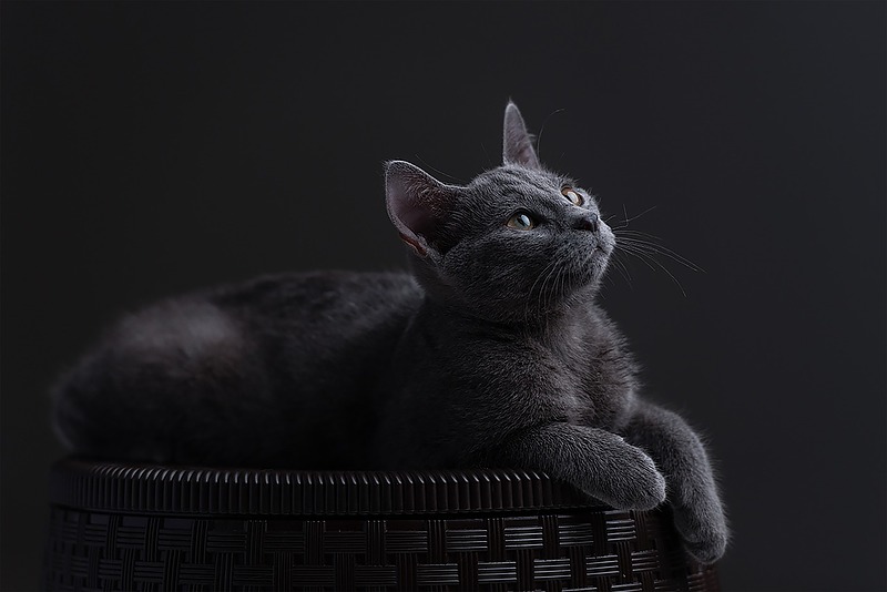 青みがかったグレーと大きな耳、綺麗な逆三角形の顔立ちが特徴のネコです。口元は少し微笑んでいるような形をしており、ロシアン・スマイルと呼ばれています。