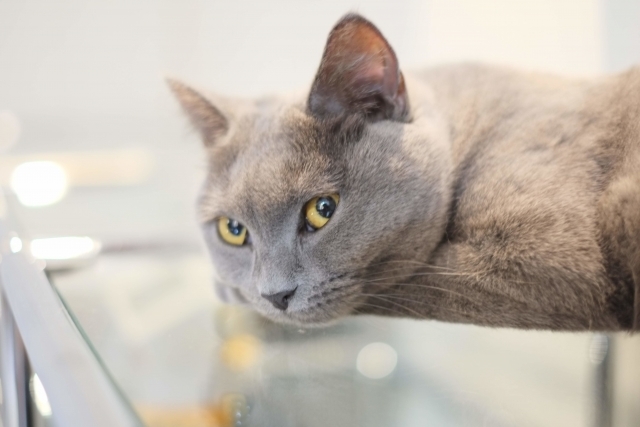 青灰色の被毛と細く小さな口、筋肉質のボディが特徴のネコです。