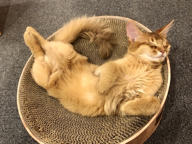 大きくアーモンド形の目と長めのえり毛、キツネのような長くてフサフサの尻尾が特徴のネコです。