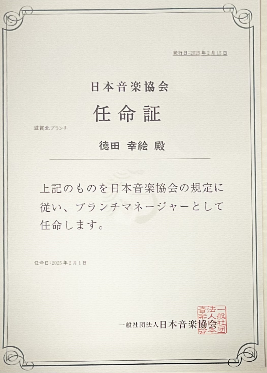 日本音楽協会のブランチマネージャー(滋賀北)を