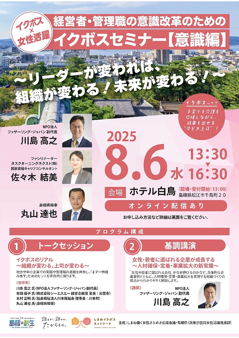 本セミナーでは、そんな組織づくりを支える「イクボス」のリアルに迫り、実際の企業の取組事例や上司たちの葛藤を共有しながら、変化の第一歩を踏み出すヒントを探ります。