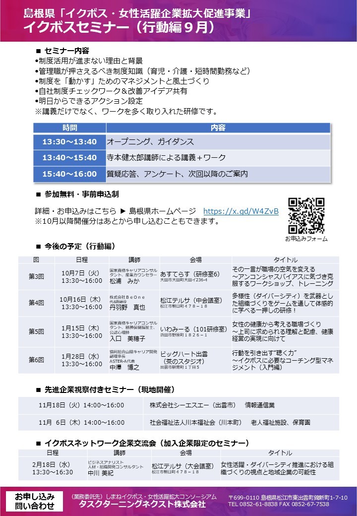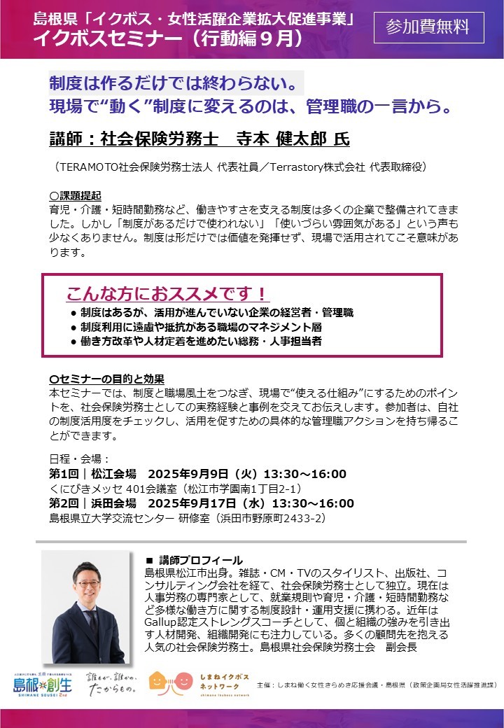 8月6日に開催された島根県「イクボスセミナー意識編」には多くの方にご参加いただき、大変ご好評をいただきました。