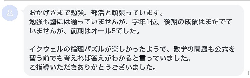 幼少期から小学6年生まで通っていただいたお子さんが学年1位で成績もオール5だそうです