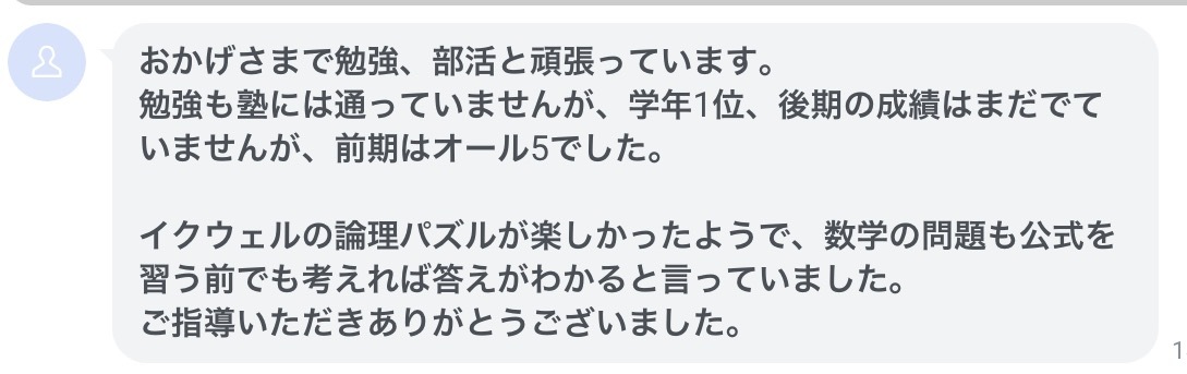昨年卒業した中1の方から近況いただきました