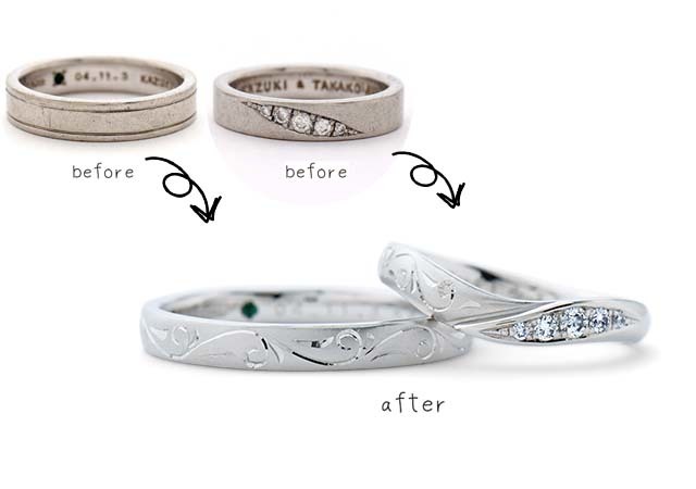 奥様の指輪は、一度リングを溶かして全体にゆるやかなウェーブを付けたデザインに作り直し、元々のリングに付いていた5石のダイヤを彫り留めしました。