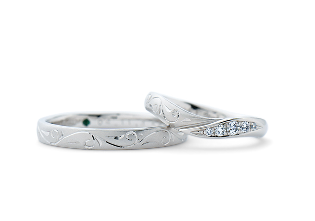 また左側には繊細な線唐草模様を彫刻し、御主人のリングとの共通点を作りました。