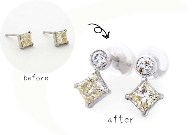 新たに0.1ctのラウンドブリリアントカットのダイヤピアスをお買い上げ頂き、プリンセスカットダイヤピアスに組み合わせました。