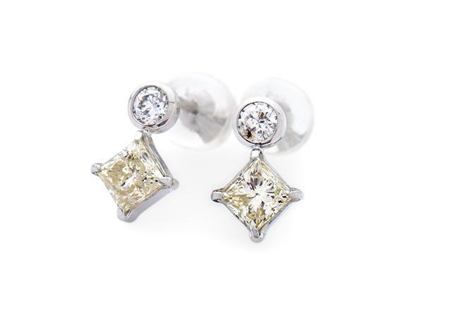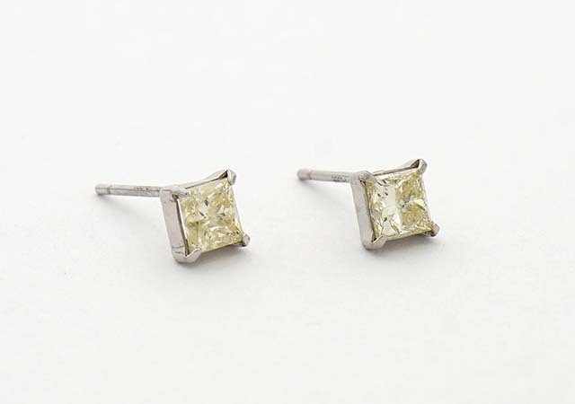 お預かりしたのは、イエローダイアモンド(プリンセスカット)0.35ctのシンプルなピアスです。
