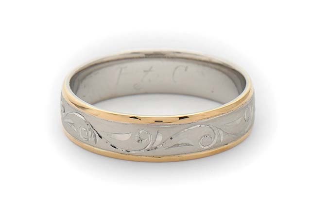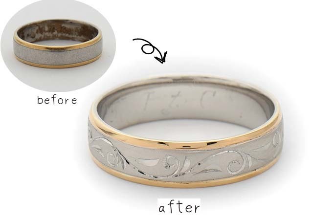 プラチナリングに18金の縁が付いている指輪をお預かりいたしまして、磨き直しと線唐草模様を彫刻しました。