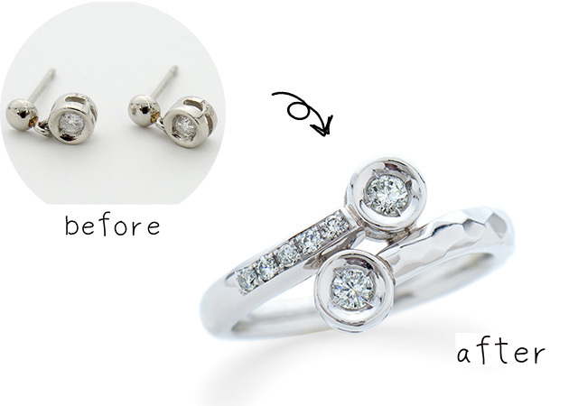 画像の一例はお客様からお預かりしたプラチナダイヤモンドピアスのデザインはそのままに活かし、プラチナのピンキーリングに仕立てたリフォーム例です。