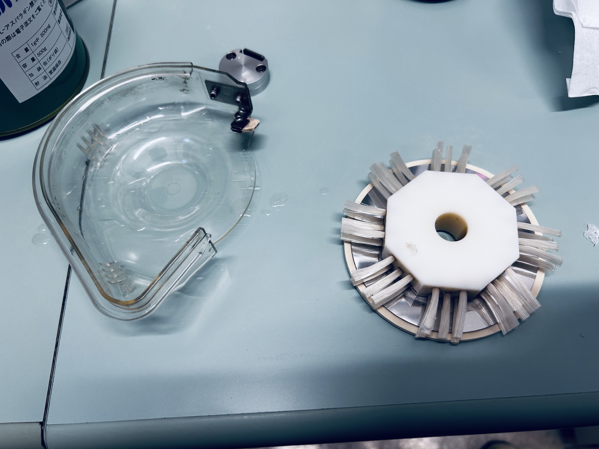 繊細な部品で満ちてますが、清掃のために細かなところまで分解できる仕様になってます。一度にあちこち手を入れるのは難しいですが「今日はここをやろう」と決めたところを一点突破するやり方です。今日は粉を受ける皿に残ったブラシ部分を綺麗にしました。