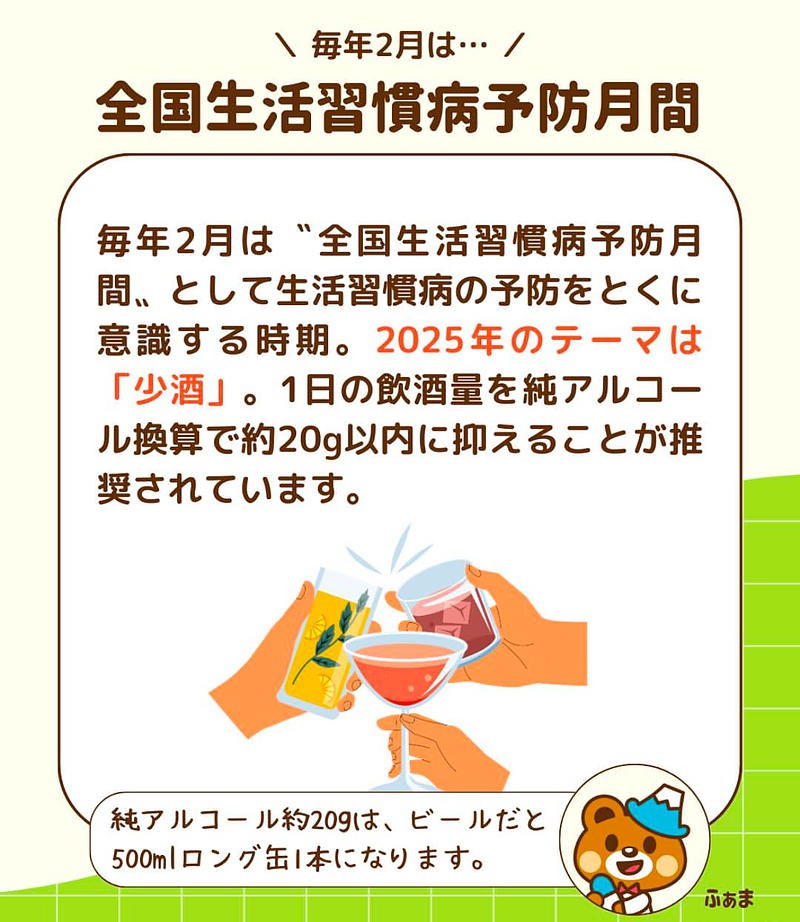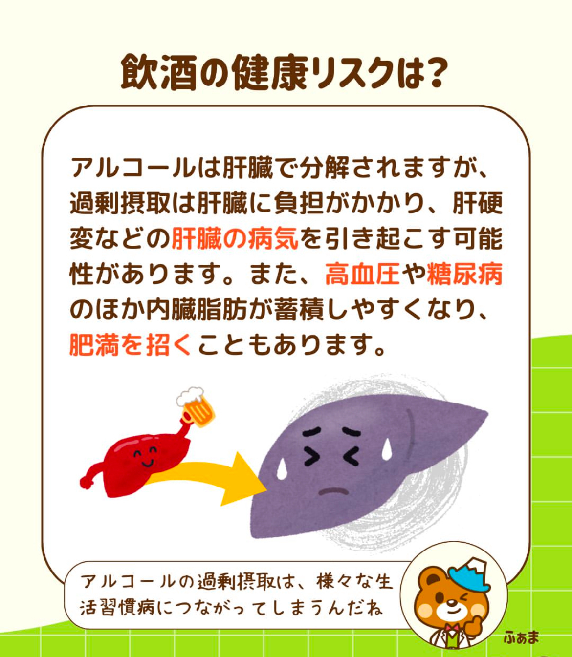 アルコールを嗜むことは楽しみの1つでありますが、アルコール依存に陥った状態は生活習慣病を引き起こすこともよくわきまえなければなりません。過度なアルコールは運動習慣を奪い、一緒に摂るアテのツマミで肥満度が高まり、高血圧、高血糖、高脂質血症などを引き起こします。直接には腎臓、肝臓といった、体の中で解毒作用を司る器官に傷害をもたらし命を縮めることになります。