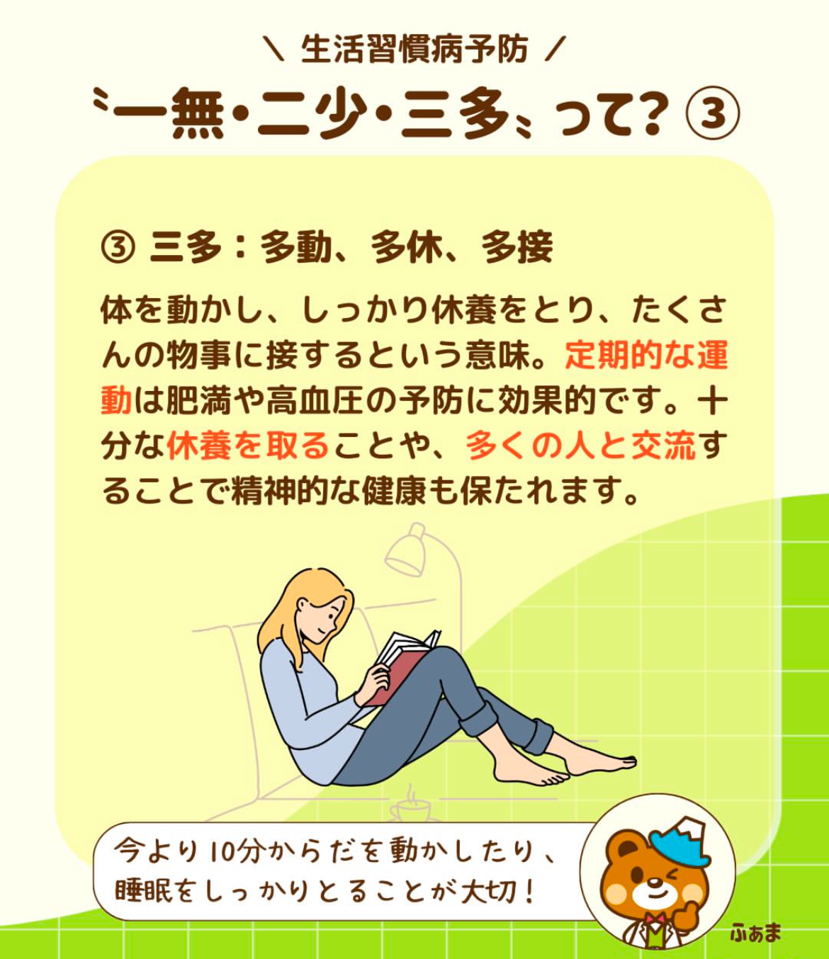 健康的な生活を送ることが何より大事。ストレスを遠ざければ、ストレス発散のための飲酒、喫煙、食べ過ぎを防ぐことになるからです。