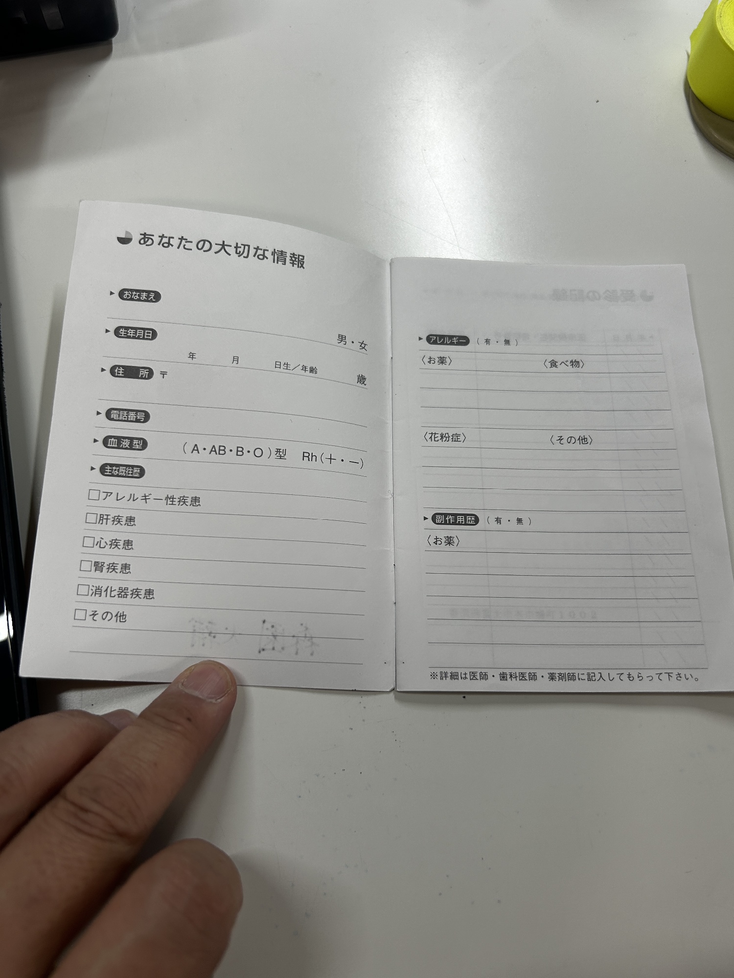 お薬手帳の中には、「血液型」や「かかりつけの病院名」「自宅連絡先」「平時の血圧」などを記載する欄が設けられているものがあります。