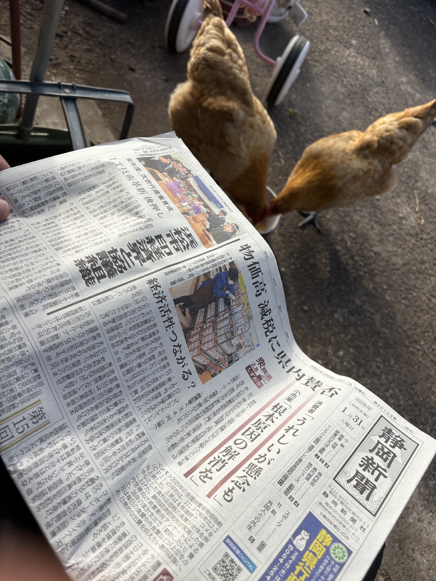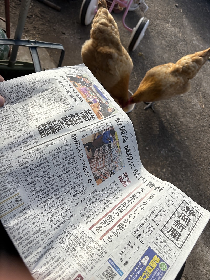 庭で元気な鶏の姿に癒されつつ、白湯を飲みながら新聞を読みます。