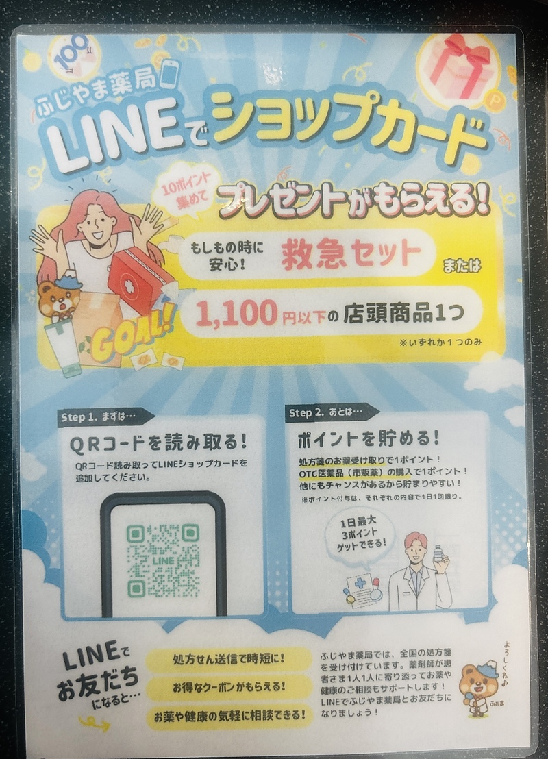 ふじやま薬局本市場町では、現在、処方箋来局並びにOTC、雑貨購入でポイントサービス中。