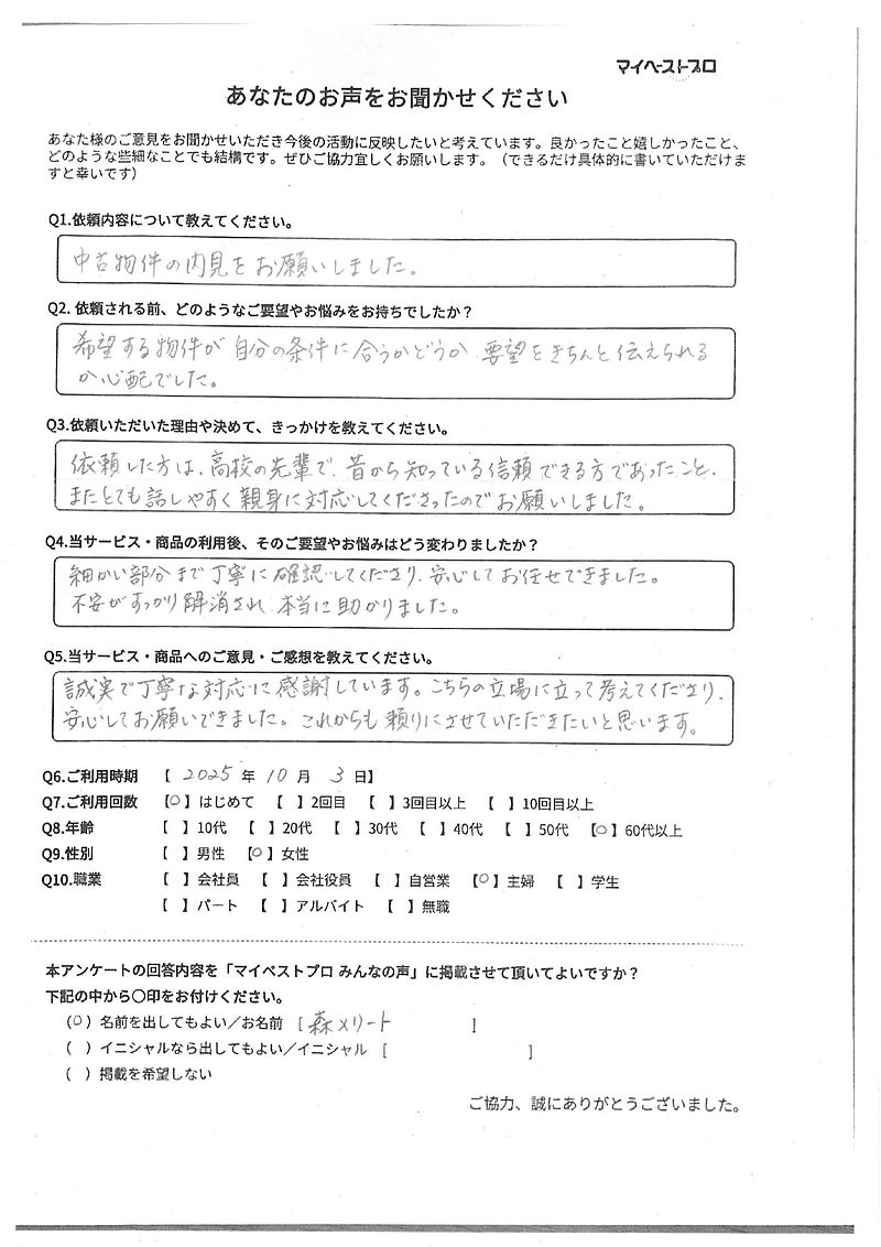(依頼される前に、どのようなご要望やお悩みをお持ちでしたか?) 希望する物件が、自分の条件に合うかどうか、要望をきちんと伝えられるか心配でした。(依頼いただいた理由や決めて、きっかけを教えてください。) 依頼した方は、高校の先輩で、昔から知っている信頼できる方であったこと、また、とても話やすく親身に対応くださったのでお願いしました。(内見後、そのご要望やお悩みは、どう変わりましたか?) 細かい部分まで丁寧に確認してくださり、安心してお任せできました。 不安がすっかり解消され、本当に助かりました。(内見後、当サービスへのご意見・ご感想を教えてください。) 誠実で丁寧な対応に感謝しています。 こちらの立場に立って考えてくださり、安心してお願いできました。 これからも頼りにさせていただきたいと思います。(お客様への対応等) 不動産の購入は、人生で最大となる大きな買い物であり、慣れている方はあまりいません。 そのため、大きな不安と期待の中、物件もさることながら、まずは信頼できる業者を探すことに苦労される方も多いようです。この度は、昔からの顔見知りということもあり、信頼していただきご相談を受けることができました。 内見では、ゆっくりと時間をかけ見ていただくことができましたが、その後は、早期に決済まで行いたいとのご希望でしたので、契約と引渡しも一日で行い予定通りの日程で完結することができました。 これからも、ご自宅で生涯、幸せに暮らしていただき、ご自宅同様に末永くお付き合いいただければ幸いです。