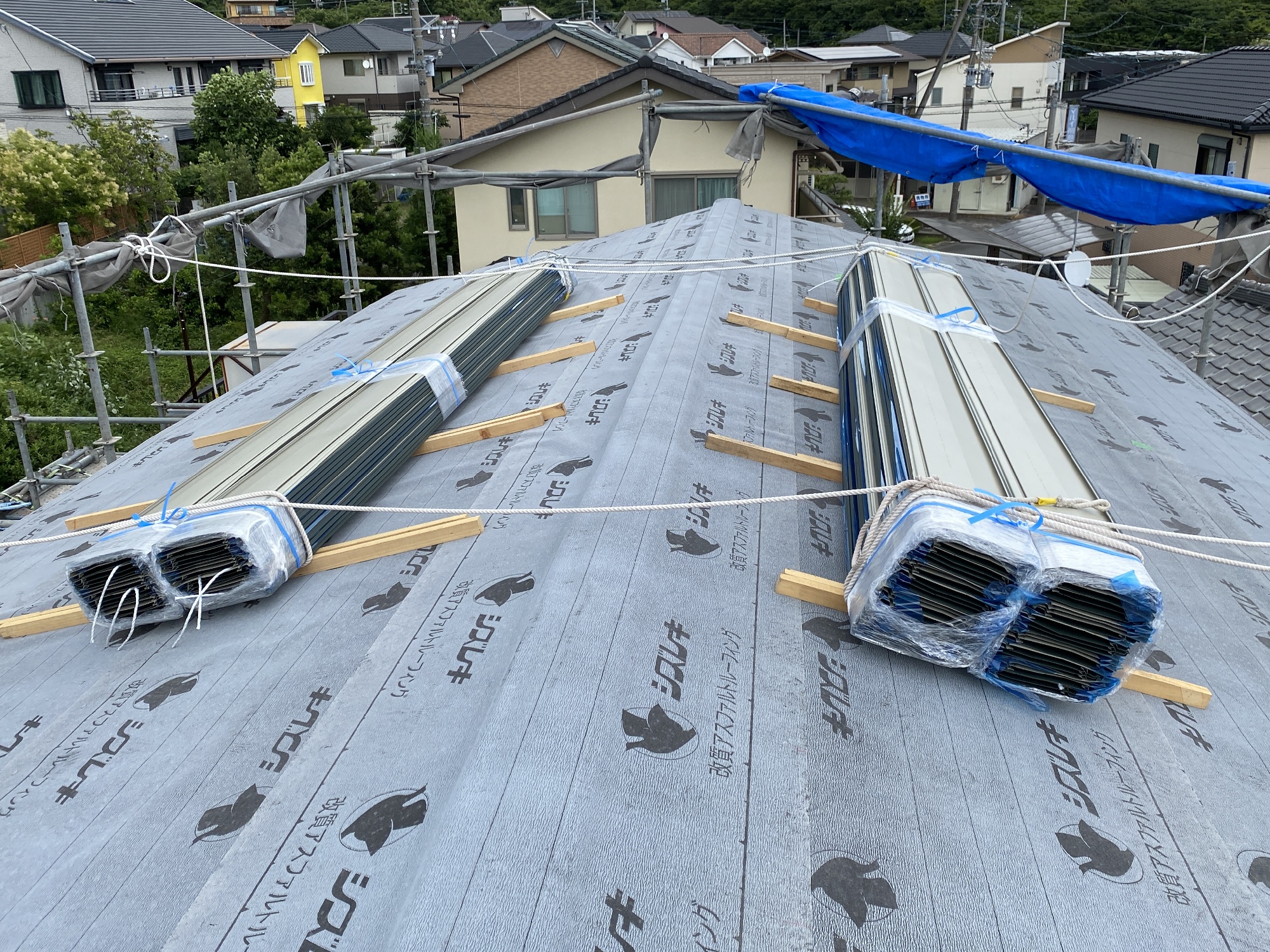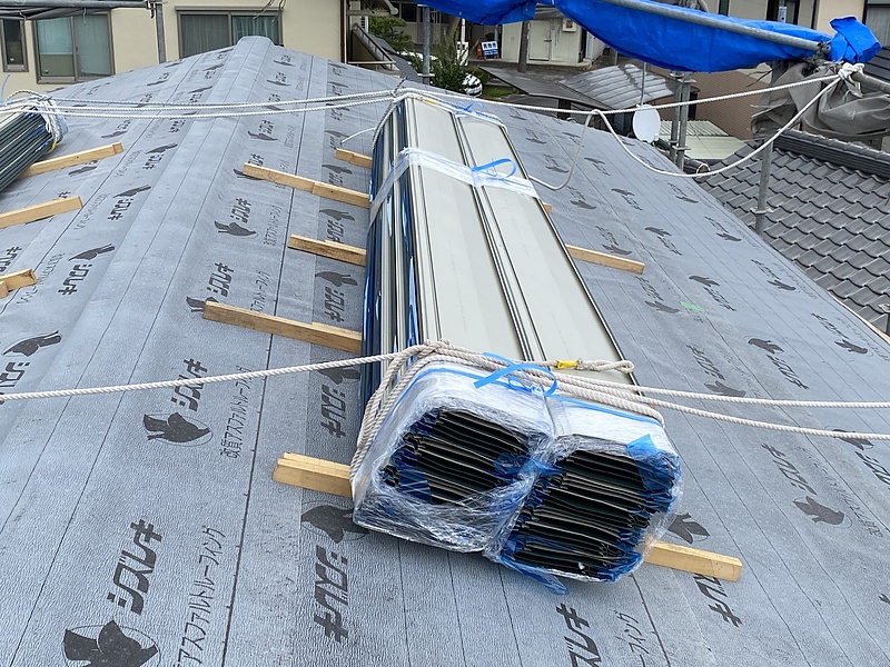 ガルバニウム鋼板段ぶき屋根をカバー工法で施工します。